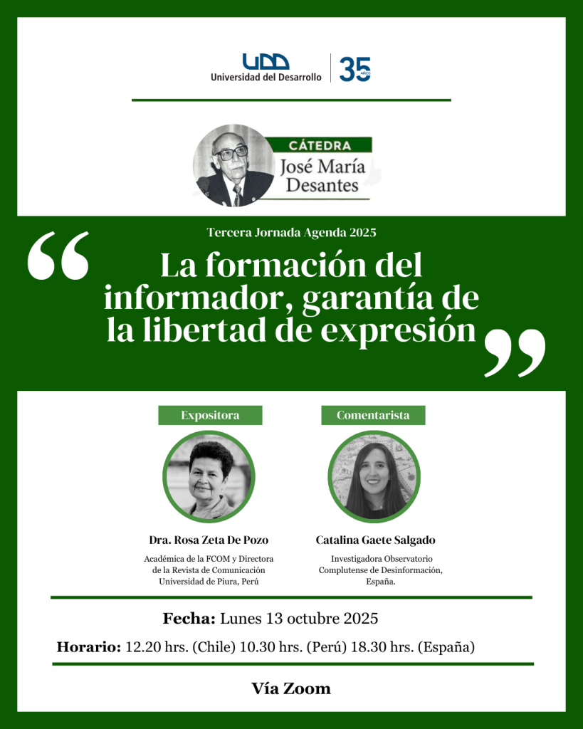 Entre agosto y noviembre, realizaremos la segunda versión de la Cátedra José María Desantes, a través de charlas presenciales y encuentros en línea, qué reunirán a académicos internacionales junto a estudiantes de Santiago y Concepción.